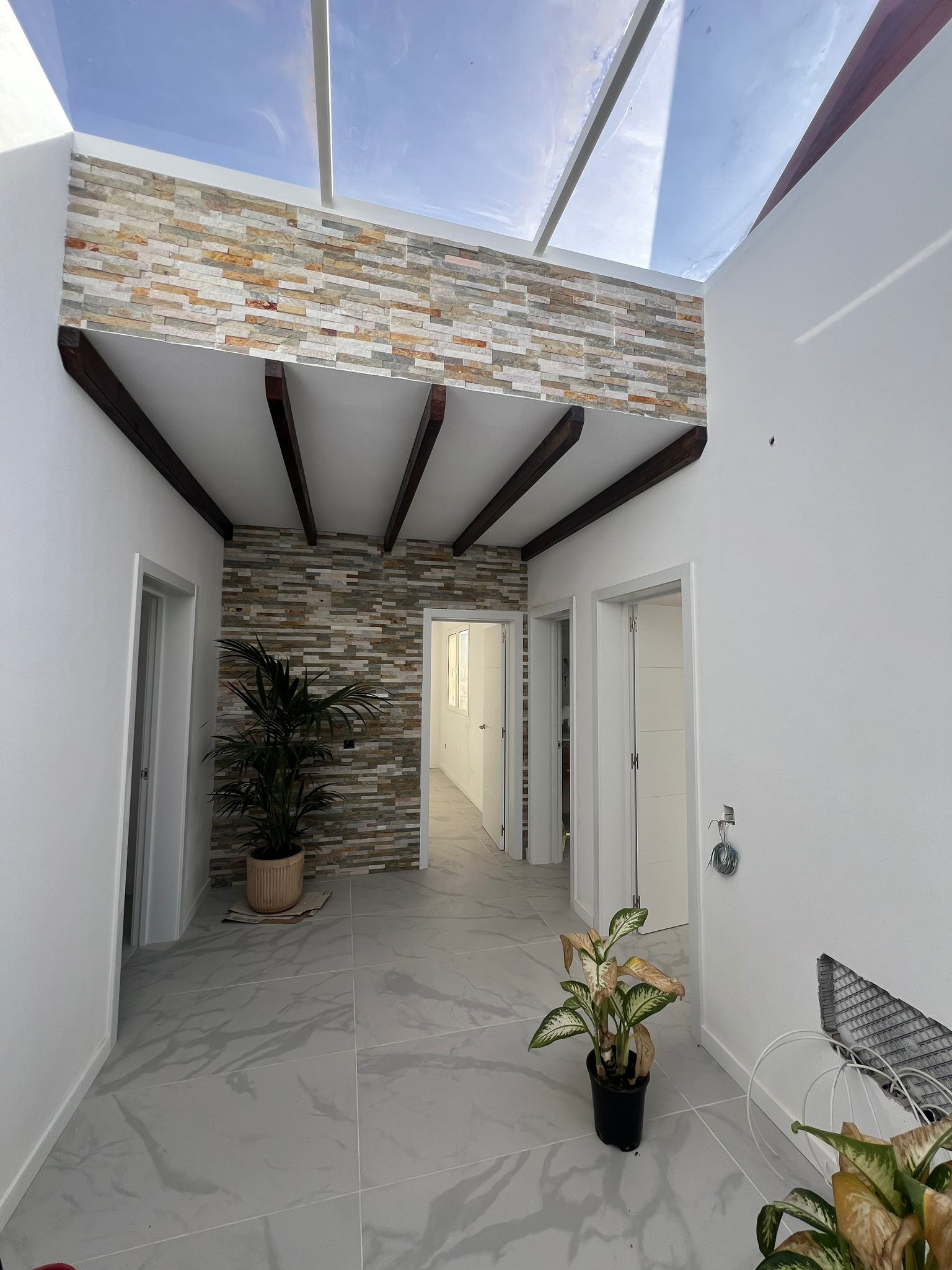 It consists of an entrance hall, large living room, eat-in kitchen, large, very bright anteroom area, three bedrooms, one of which is a suite with private bathroom and walk-in closet and a shared bathroom.